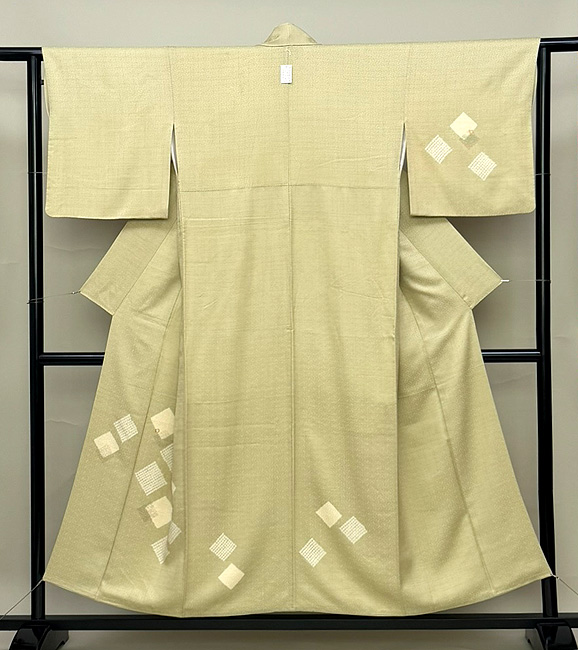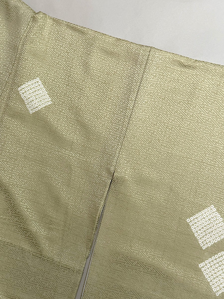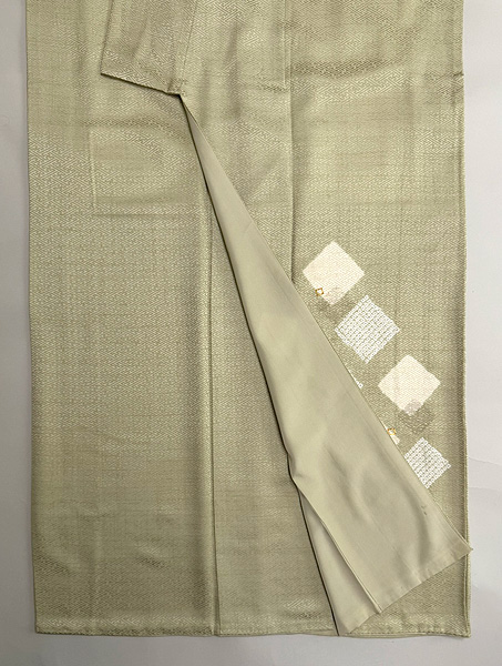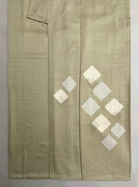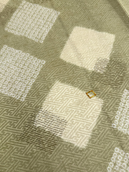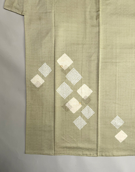 裾に石畳文様が絞りで表現されていますが、四角の石は白く残り、鹿子絞りの所は地色の柳色が見えて、紗綾型の地紋の妙味が美しく生かされた付下となっています。