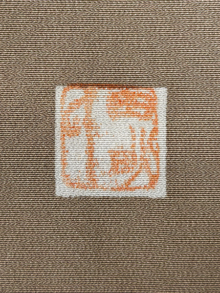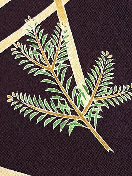 白い線で表現された菊とベージュ色の紅葉がベースにあり、その上に所々、散りばめられた紅葉の黒と緑、そして菊の中心のオレンジがアクセントになって全体を引き締めています。
