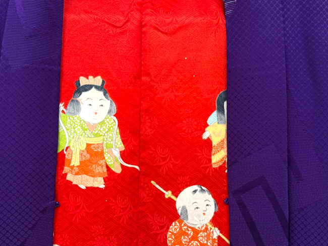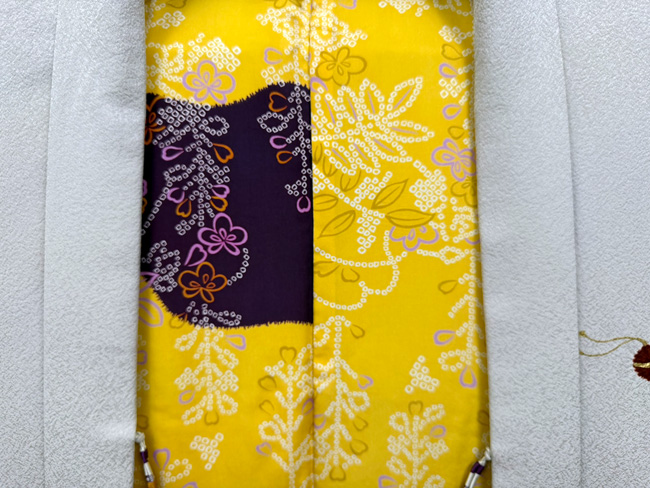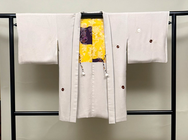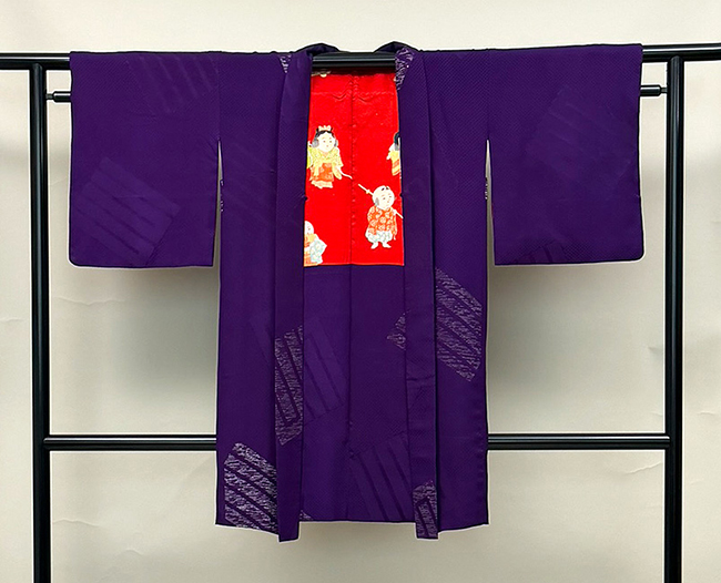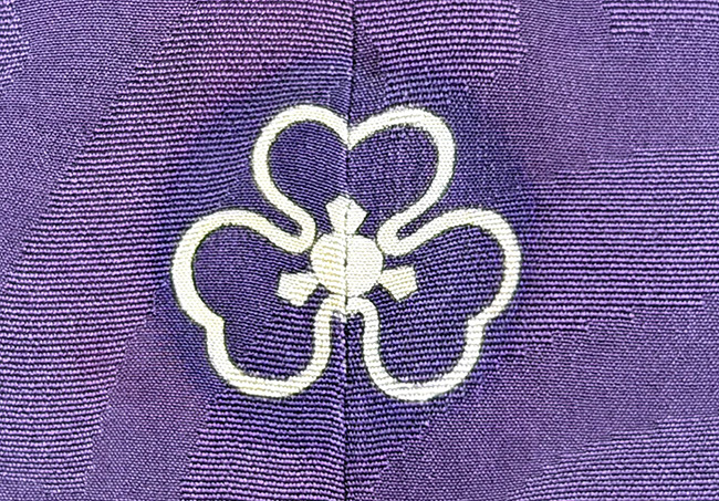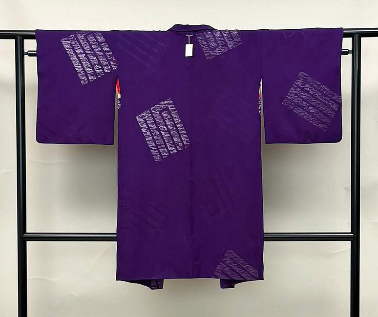 鮮やかな紫色の羽織は、地紋に疋田絞りの柄と源氏香が織り出され布に重厚感を演出しています。