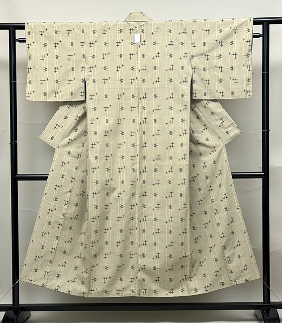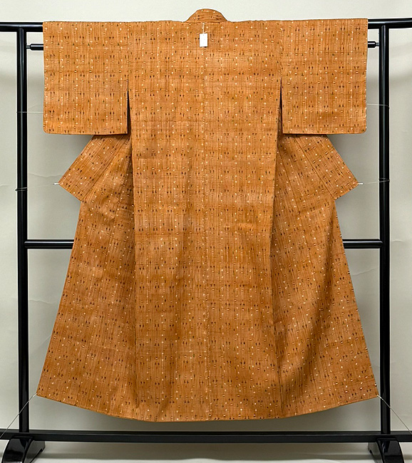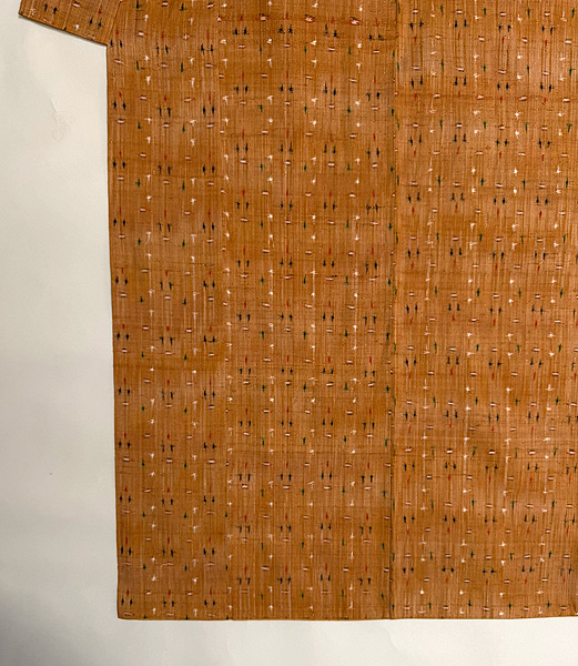 小さな絣なので、オレンジ、黒、緑、白とカラフルですが、嫌味なく、それでいて今はあまり見かけない、新鮮な印象の着物です。