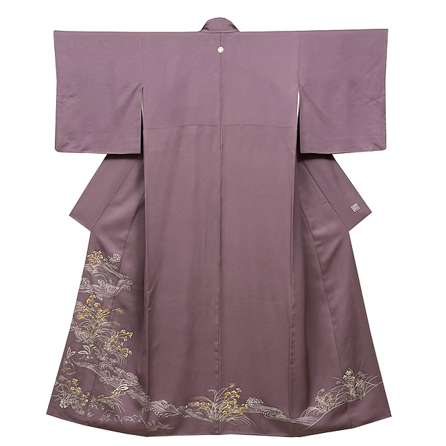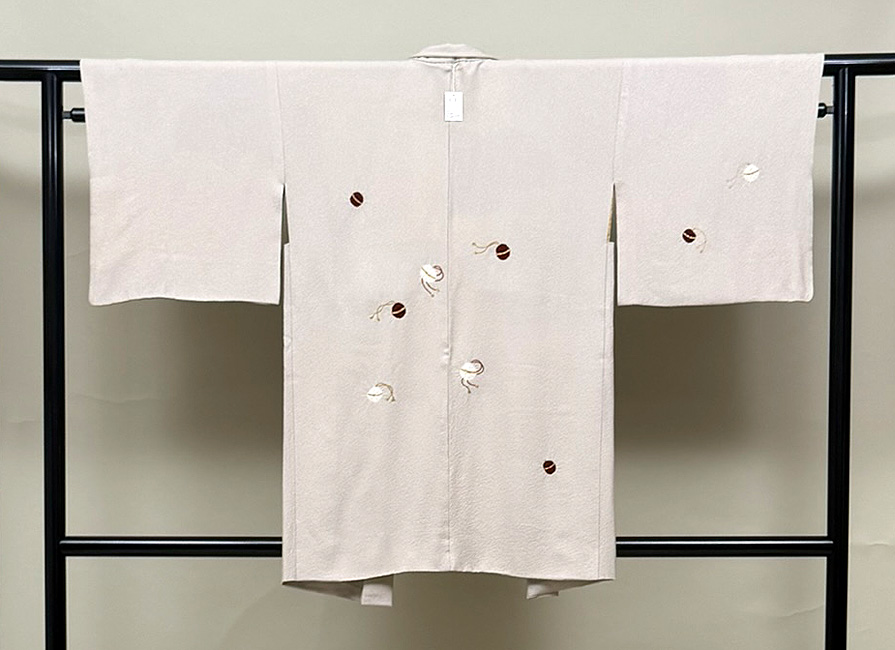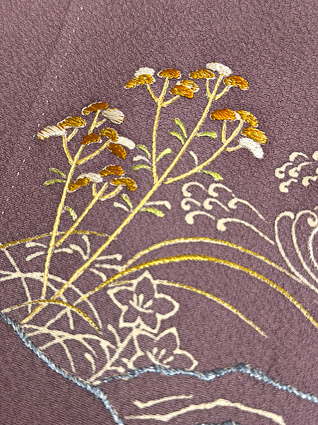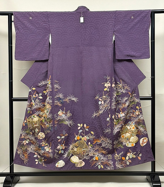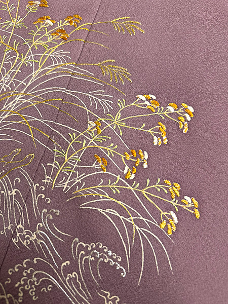 金糸、銀糸、刺繍が施されて、しっかりとした個性があるものの、決して大袈裟にはならない調和のとれた意匠の着物です。