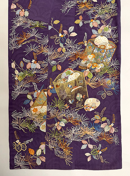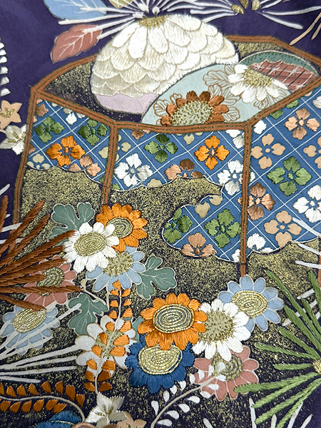 松も桐も色とりどりの糸で刺繍が施されていて、貝桶からこぼれおちる貝合わせの貝も蒔絵を表現するように刺繍され梅や菊が刺繍されています。
