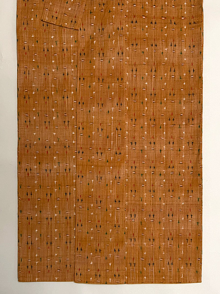 節のあるざっくりとした金茶の紬に、まるでペイントしたみたいな絣の色が映えます。