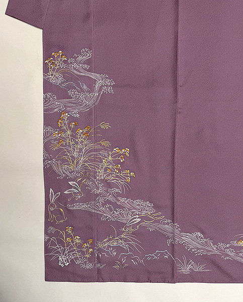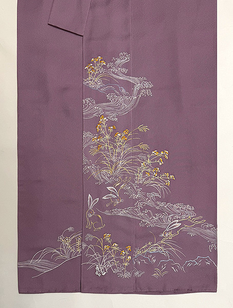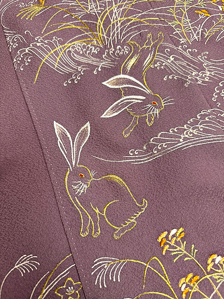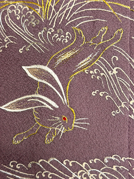 鳩羽色の落ち着いた地色に草花文様、流れるような波間には兎。