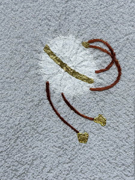 グレーの東雲縮緬に鈴は絞り、紐を刺繍で刺しています。