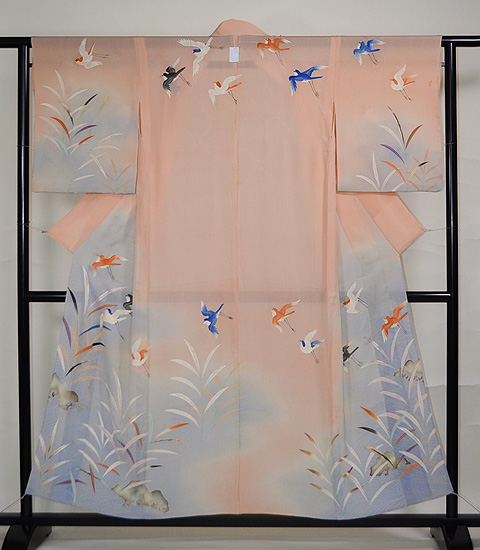 ピンクの中に燭光文様の大きな地紋、裾の水辺には、水色のぼかしのなかに、丁寧な波紋が友禅でなされています。