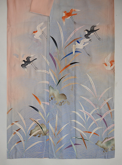 ピンク地葦辺に千鳥の付下