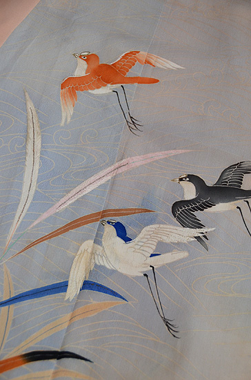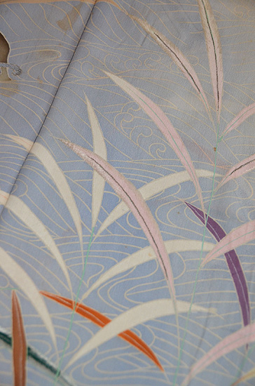 裾の波の部分は、友禅で青く色が刺されていますが、その上から、地色と共色の紗を張って、刺繍で固定されているという手の込んだ仕事ぶりです。