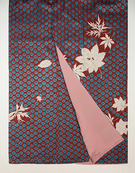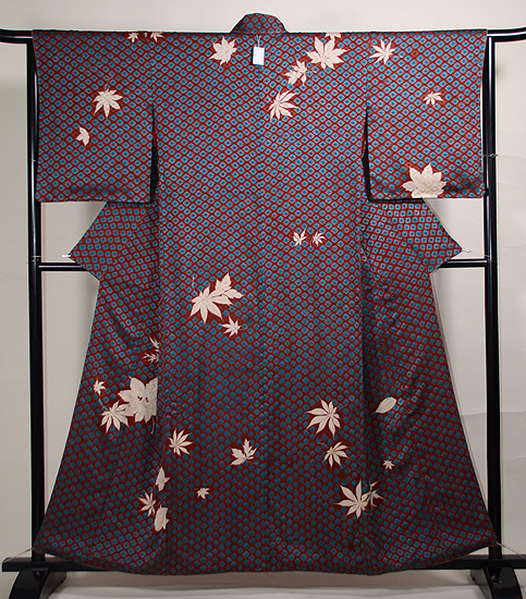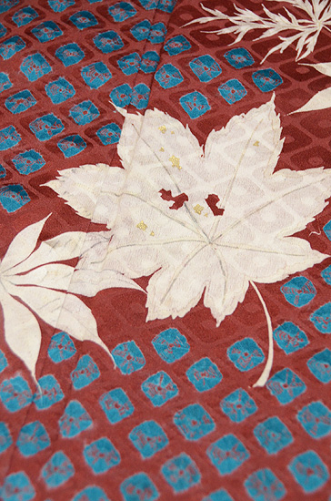紗綾形の地紋が美しい錦紗地に、クヌギの葉っぱが優しく色ずんで描かれています。