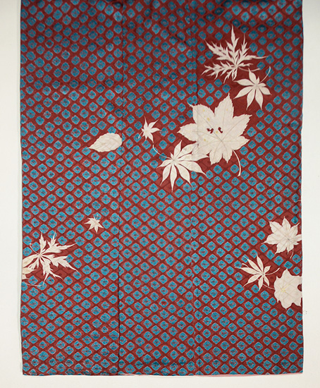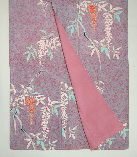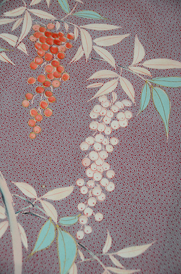 葵は葉っぱの白い葉脈に個性があり、所々に見られる七宝梅と笹の小さな図柄にも心惹かれる爽やかなお着物です。