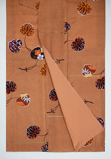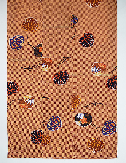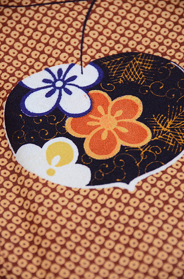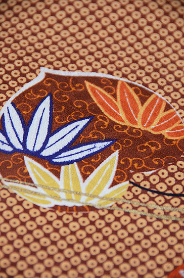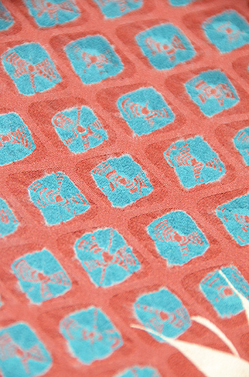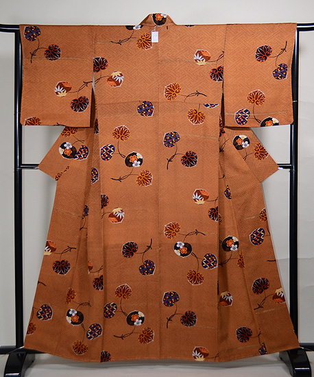 赤茶に樺色と黒がアクセントにはいり、リズミカルでキュートな小紋です。