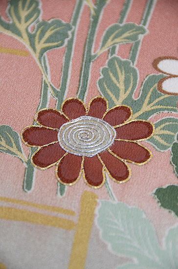 どちらかというと苔色に近い落ち着きのある中で、大輪菊の刺繍の華やかさが引き立ちます。