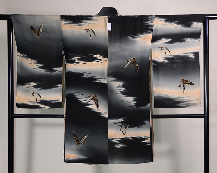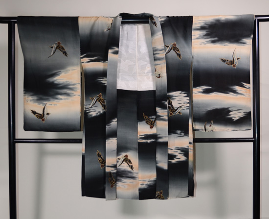 1羽の孔雀の羽根で、一枚の着物が全て覆われています。