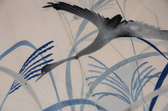 墨黒の地色に烏と鷺とが織り出されています。