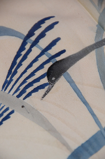 始めに臈纈染めを施して、色を挿し、最後に線描きをする、という手の込んだ飛び小紋です。