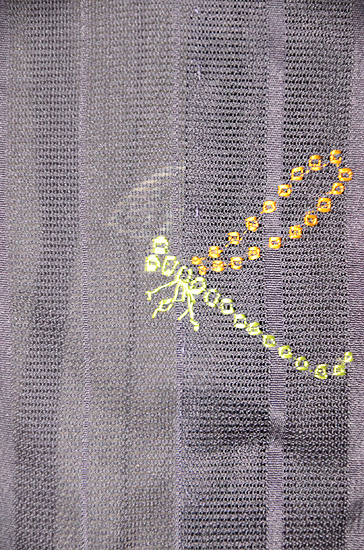 着物一面を萩の透かし模様が覆い、大きなトンボが自在に飛んでいます。
