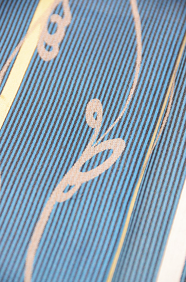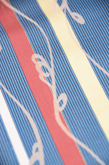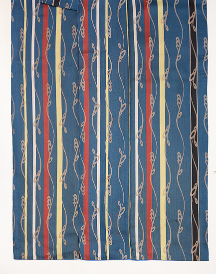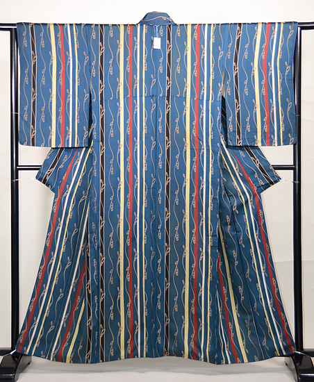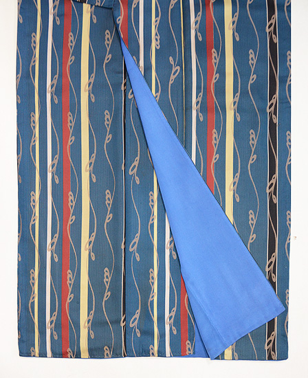 太い縞に絡むワラビの模様がアールデコ調で、ブルー地の中にも万筋が走り、少し小粋なお出かけ着です。