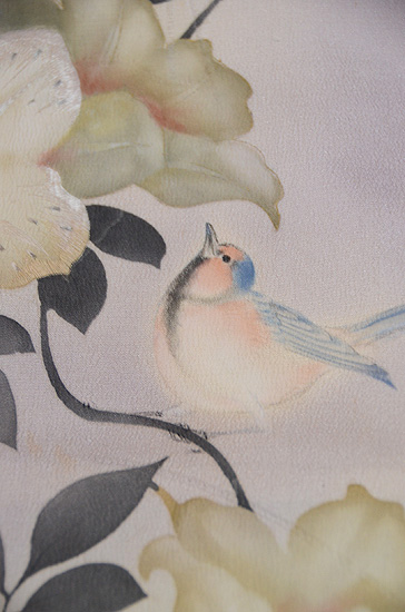 立派なトサカや、みごとな羽根の様子、しっかりとした足元など、伊藤若冲のようだとはおこがましいながら、実に丁寧でまた勢いのある、まさしく画家の手になる友禅かと思われます。