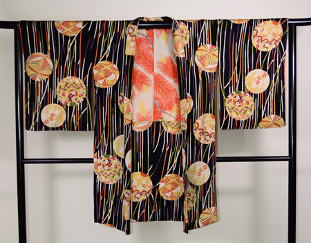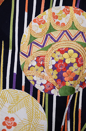 縦縞のような色取り取りの紐文様が小粋なアクセントとなり、黒地とのコントラストが綺麗な一着です。