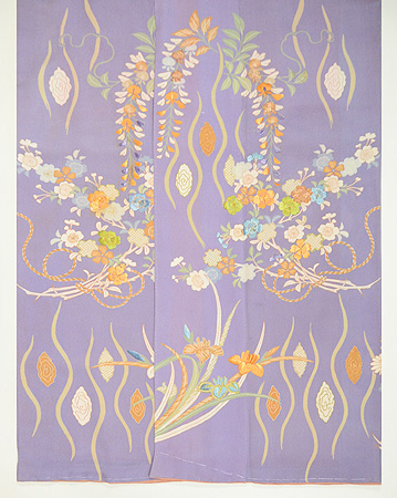 裾模様は、糊置きで防染した後に、胡粉で彩色した藤の花が華麗に描かれています。