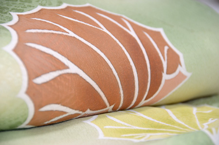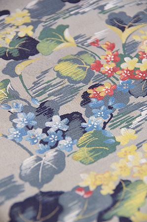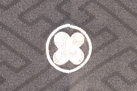 幾何学文を本疋田で、紗綾形の緞子には春蘭と晩菊がおりこまれています。