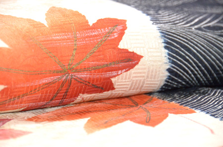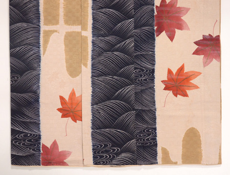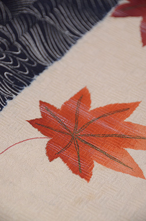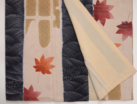 大胆に、縦に波模様が走り、ふわりふわりと散る紅葉の赤が映えています。