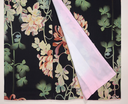 きらびやかな訪問着が多い中、伸びやかに枝も葉も石榴の一色だけで、手描きされたやさしくて印象的なお着物です。