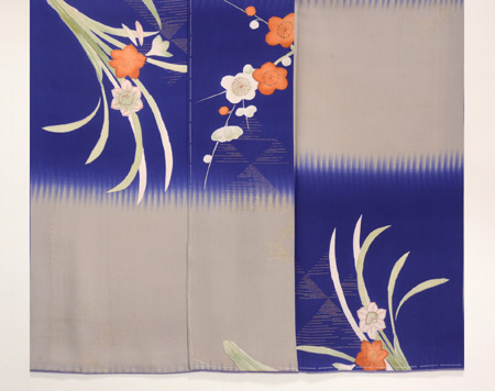 青みの強い紫とグレーの大きな市松に、菊、梅、水仙の花が散る小紋。