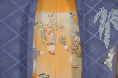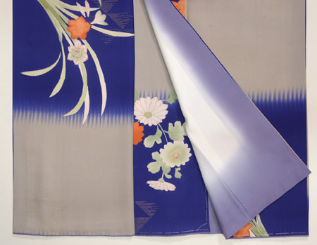 一越縮緬地に何枚もの型を重ねて染め上げた見事な着物です。