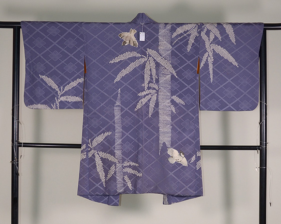 薄鼠色に入子菱の地紋織りの上に絞りの大きな竹と笹。