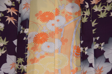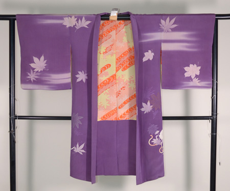 濃紫地に白い小菊と枝垂れ紅葉を配した秋らしい羽織。