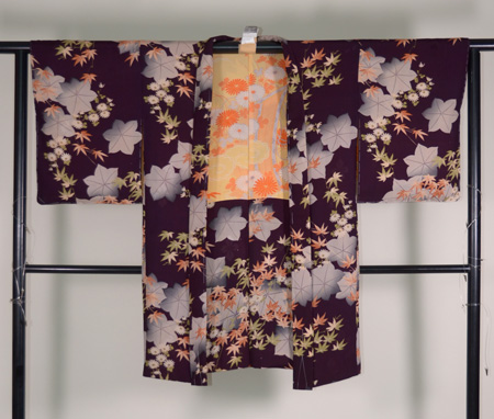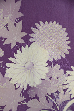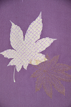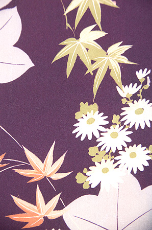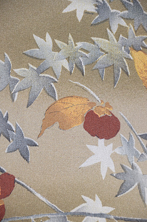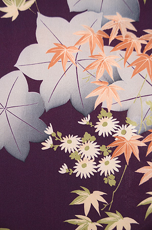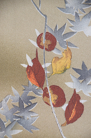 葡萄鼠色地に織りではらはらと落ちる紅葉を表し、裾模様には菊と紅葉の花束を染め、部分的に疋田絞りを施しています。