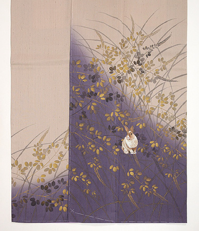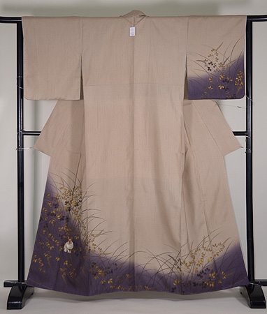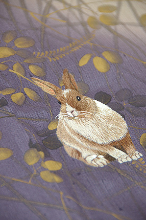 袖と裾に褐色(かちいろ)の無線友禅で一面の萩が描かれて、ウサギが一匹そっと覗いています。