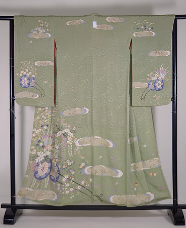 爽やかな鶸色の綸子地に可愛い花々の表現力がみごとな訪問着です。