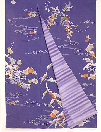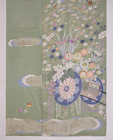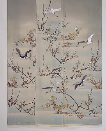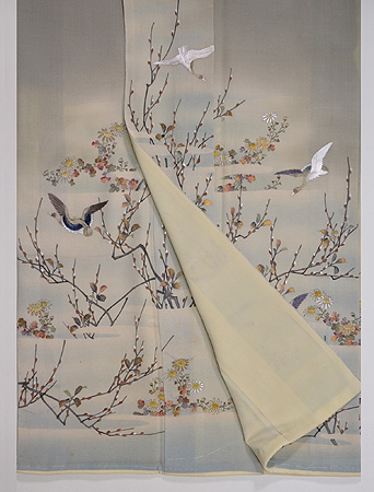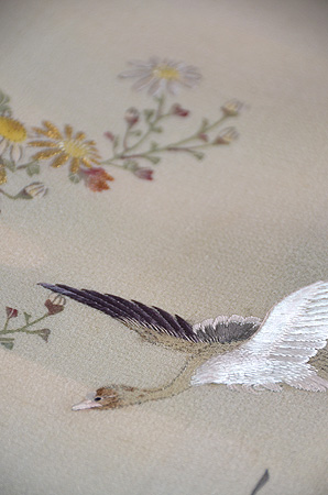 流水に四季の花が散らされて、随所に刺繍が施されています。