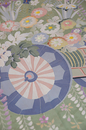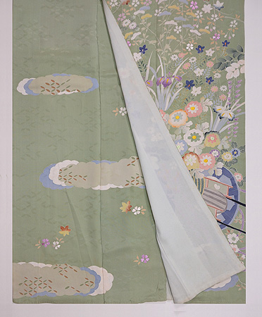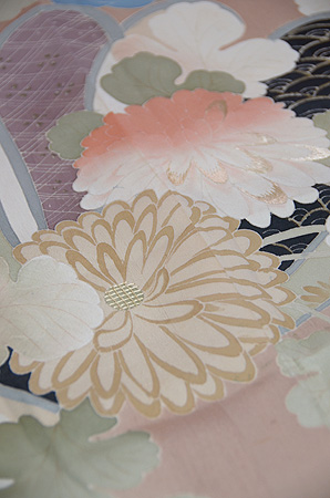 裾模様前柄には、鳳凰図の軍配と菊の花が、大きくゆったりと下前にも間垣に菊の絵冊子が明るい色で友禅されています。