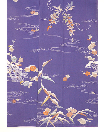 裾模様は、水辺に晩秋の野菊と、早春の猫柳といった冬の情景の明治期の友禅です。