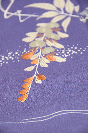 菊とカエデが散らされて、随所に刺繍が入り、特に上前には付下風に豪華に刺されています。