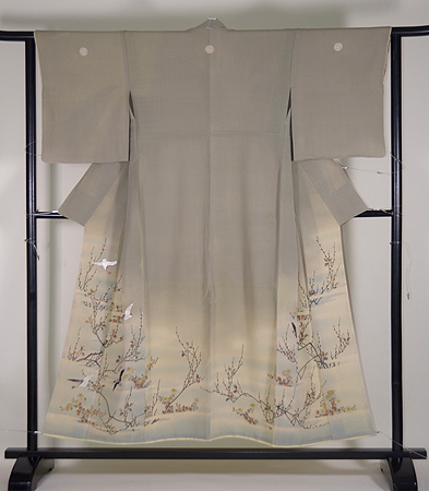 落ち着いた色合いで、合わせる帯によって表情が変わる着物です。