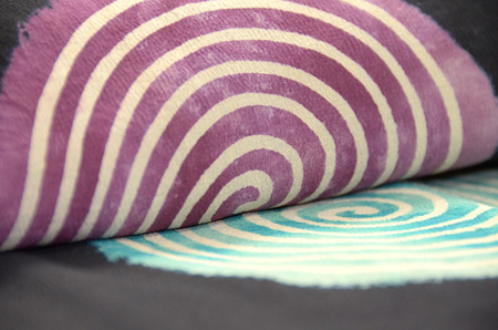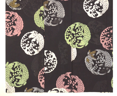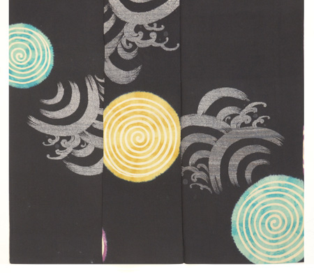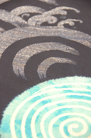 波は漆糸で、大きな渦は絞りの中に筒書きで糊防染されて、白い線を作り出しています。
