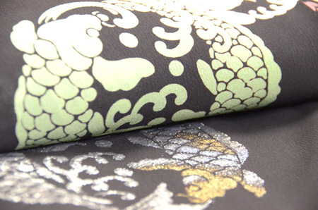 夏虫色といわれる、地色に裾いっぱいの孔雀の羽根がはなやかです。