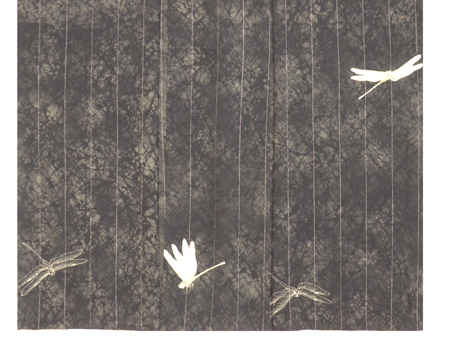 地の染めは、型紙で吹き付けなのか、絞りなのかはっきりしませんが、効果的な陰影をつくりだし、涼しげな演出満点の上質なお着物になっています。