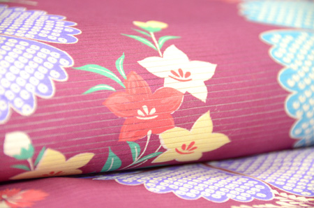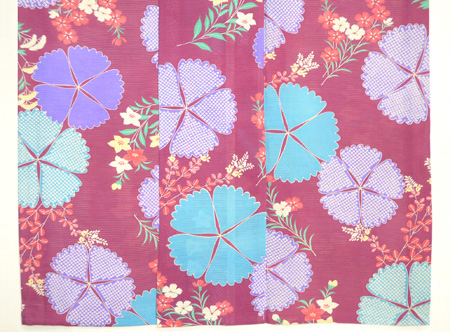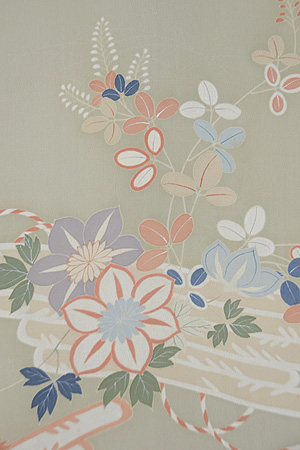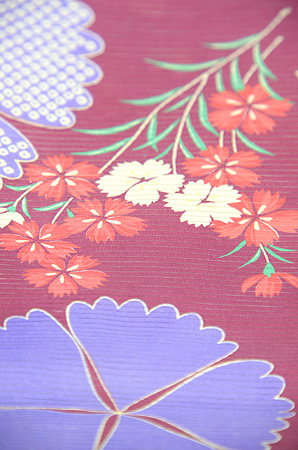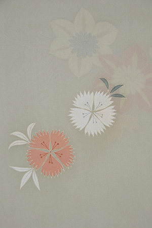 デザイン化された撫子がなんとも可愛らしく、赤紫の絽地に疋田柄も交えて、水色、紫でぽんぽんと咲いています。