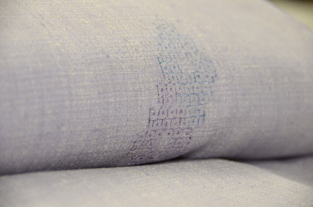 黄色に藍をかけ、その藍を重ねて濃くし、格子の糸としています。