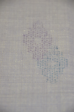 広い空間と雲のように浮かぶ絣柄が、ふわりとした真綿絣の柔らかさを良く表現しています。