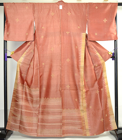上身頃は細い経縞の上にひし形紋が刺繍され、やさしい風合いに仕上がっています。