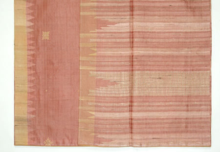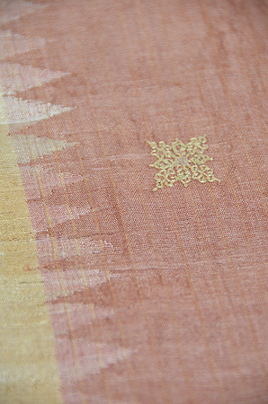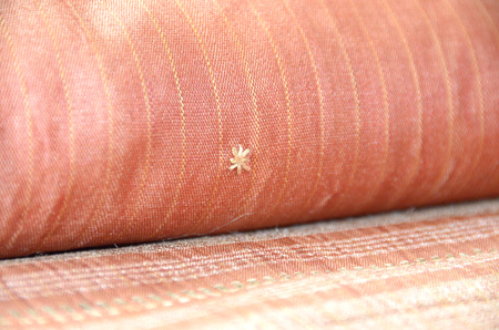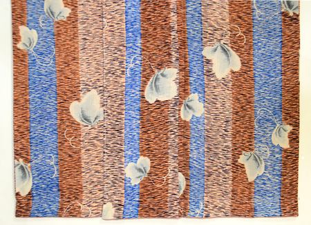 黒の経糸と辛子色の緯糸で織りなされた茶色の地に、木綿糸で紋織りが施してあります。
