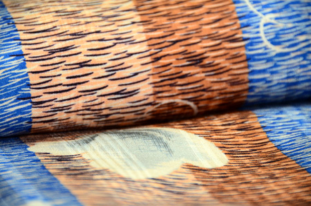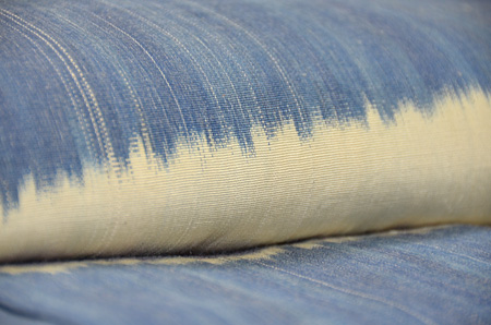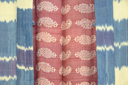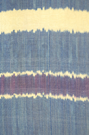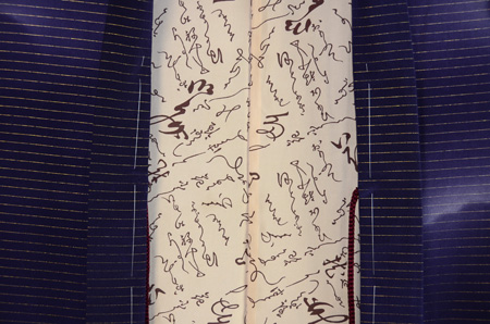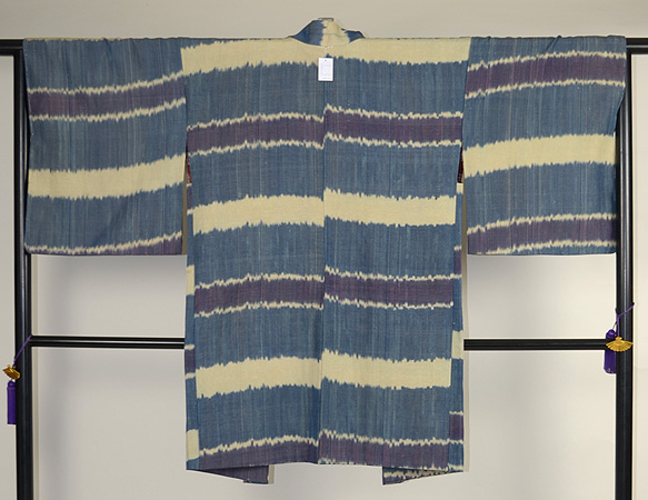 縞と緯抜きの柄とが美しいハーモニーを奏で、裾の装飾となっています。