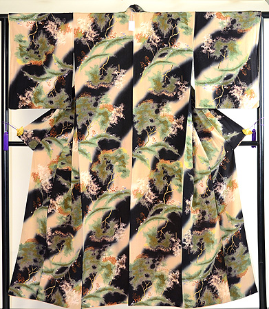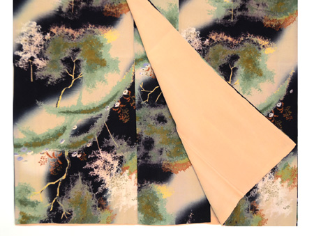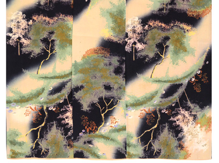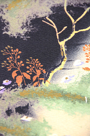 樹林という不思議なテーマですが、微妙な色使いによって幽玄漂う、どうしても気になるムードの着物になっています。