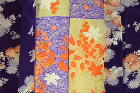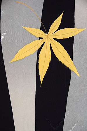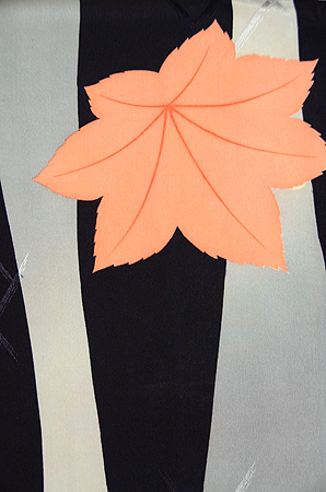 桧垣紋の錦紗に落ち葉が舞い散っています。